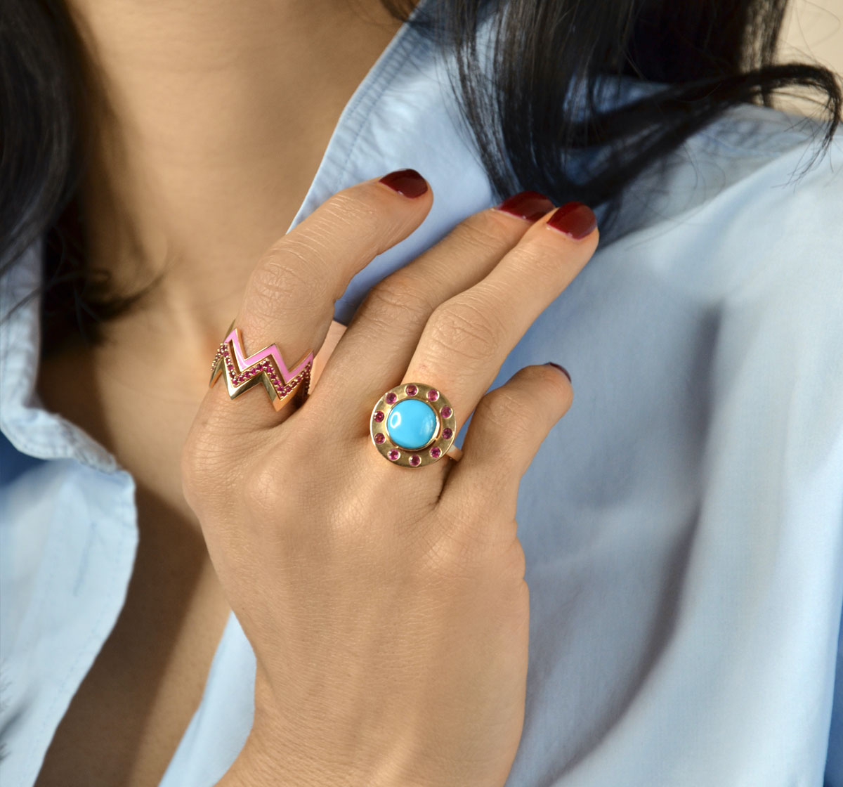 SHIELD RING | BLUE TURQUOISE & PINK TOURMALINE | SMALL